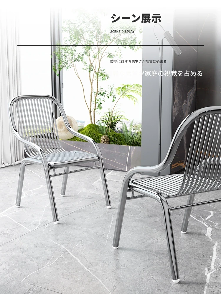スタイリッシュなダイニングチェア - 小型住宅に最適な背もたれ付き!軽やかさと高級感を兼ね備えたステンレス製の椅子。モダンでシンプルなデザイン、アイランドテーブルにもぴったり。おしゃれな食卓を演出します!