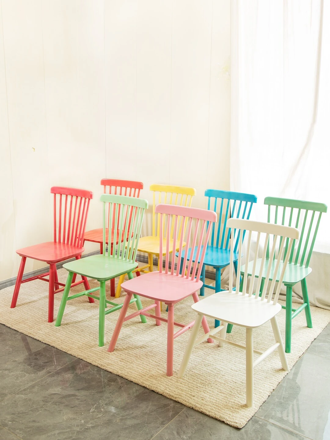 ウィンザーカラーマカロン実木ダイニングチェア - 心地よい背もたれ付き、北欧スタイルのカラフルなデザインで、家庭やホテルにぴったり!天然木の温もりを感じながら、毎日の食事を特別な時間に。