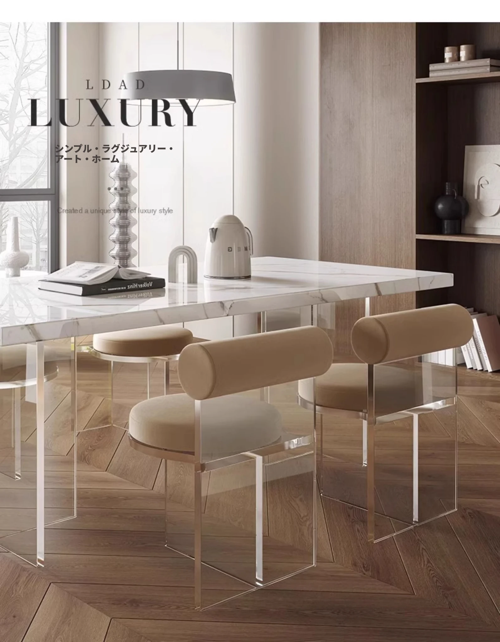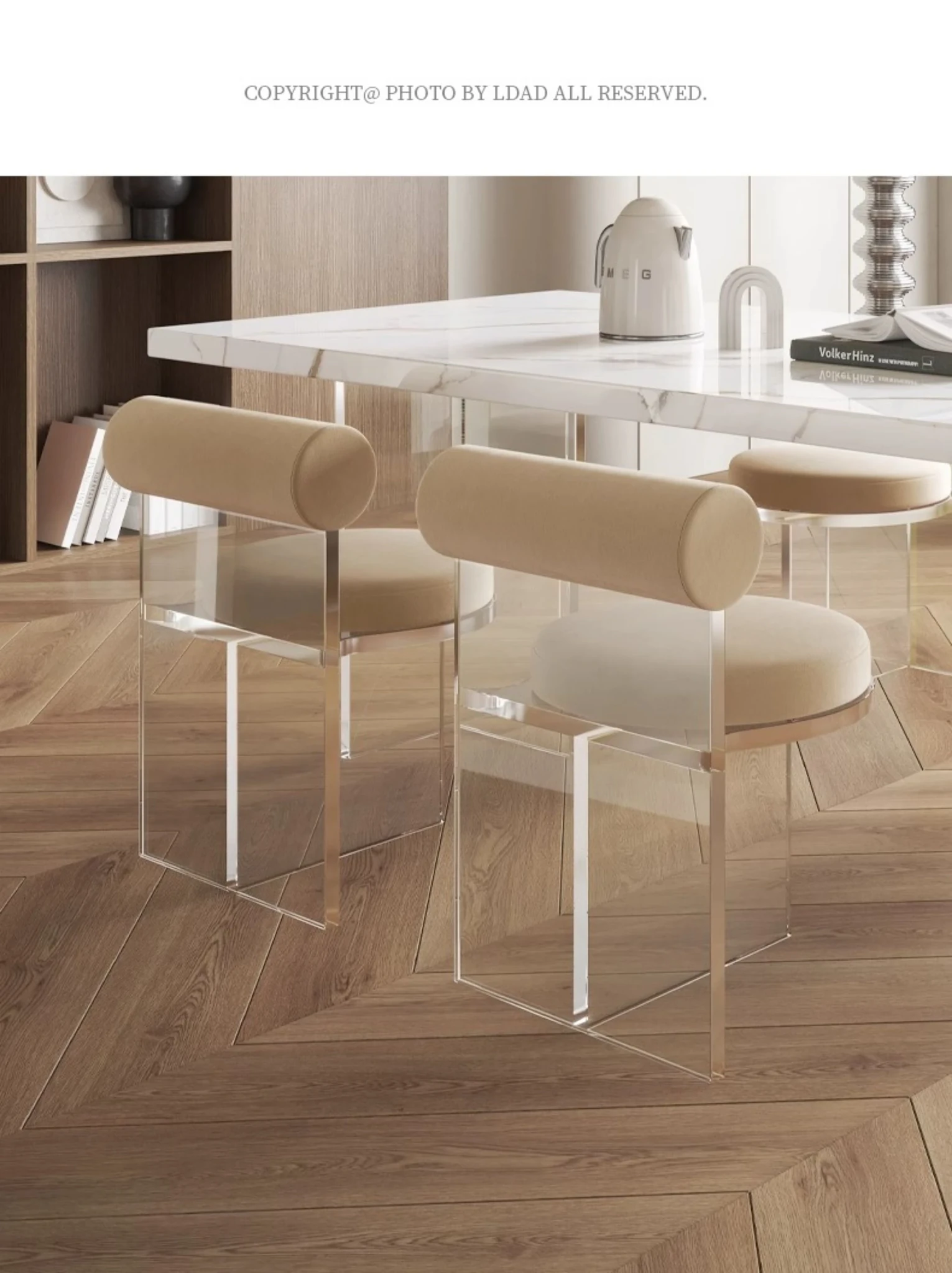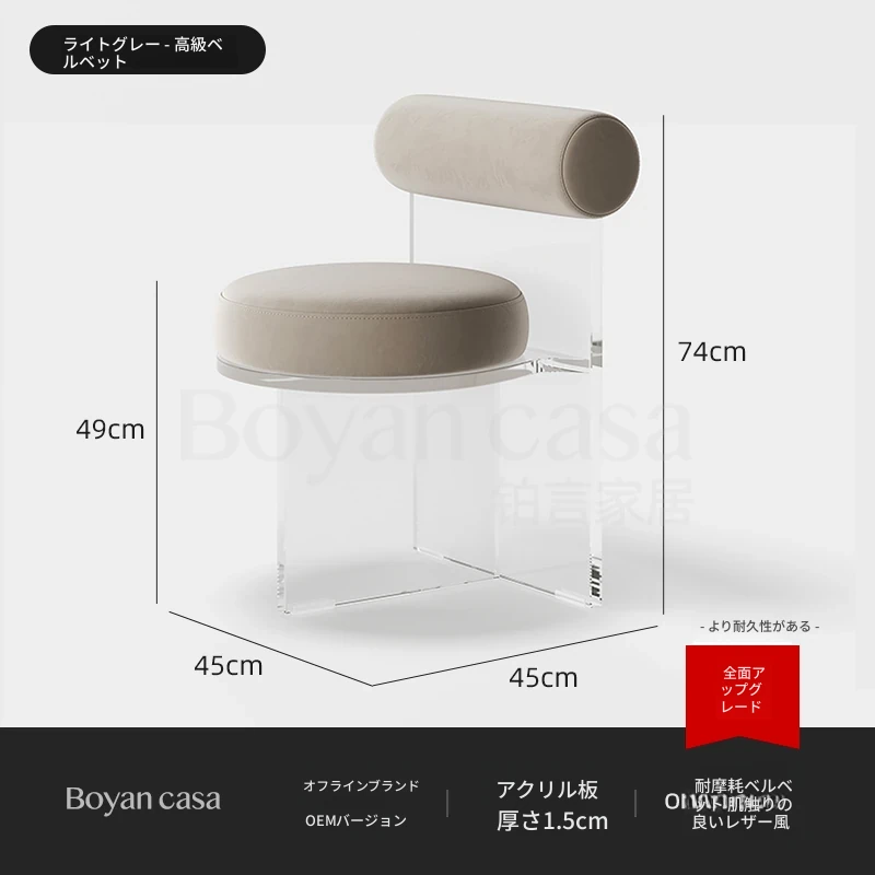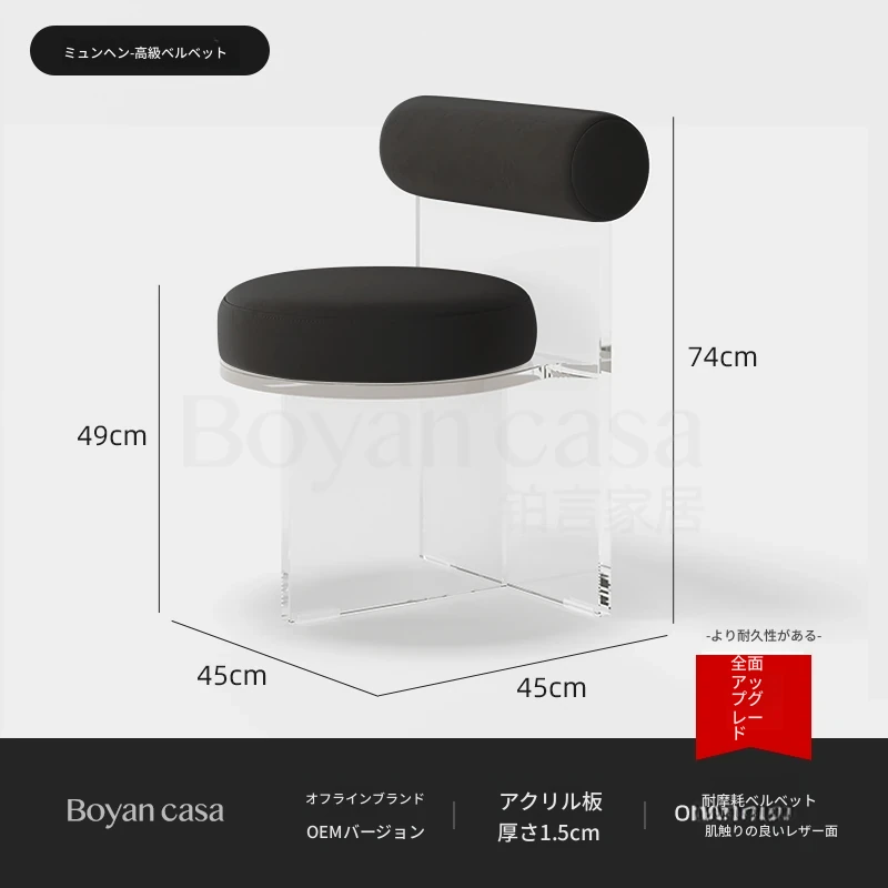 BOYANイタリアンミニマリズムの高級感漂う島台用チェア、透明アクリルの浮遊感あるデザイン。洗練されたスタイルで、おしゃれなダイニング空間を演出します。
