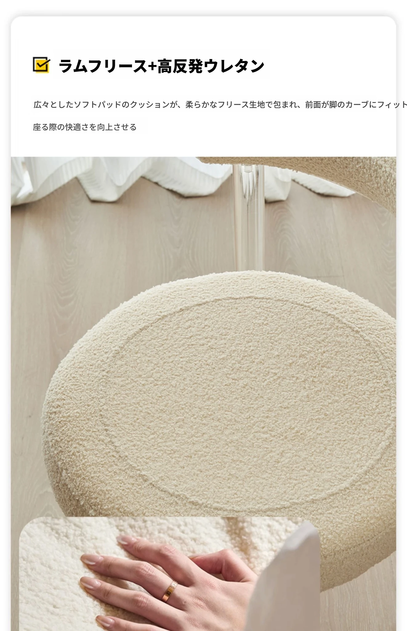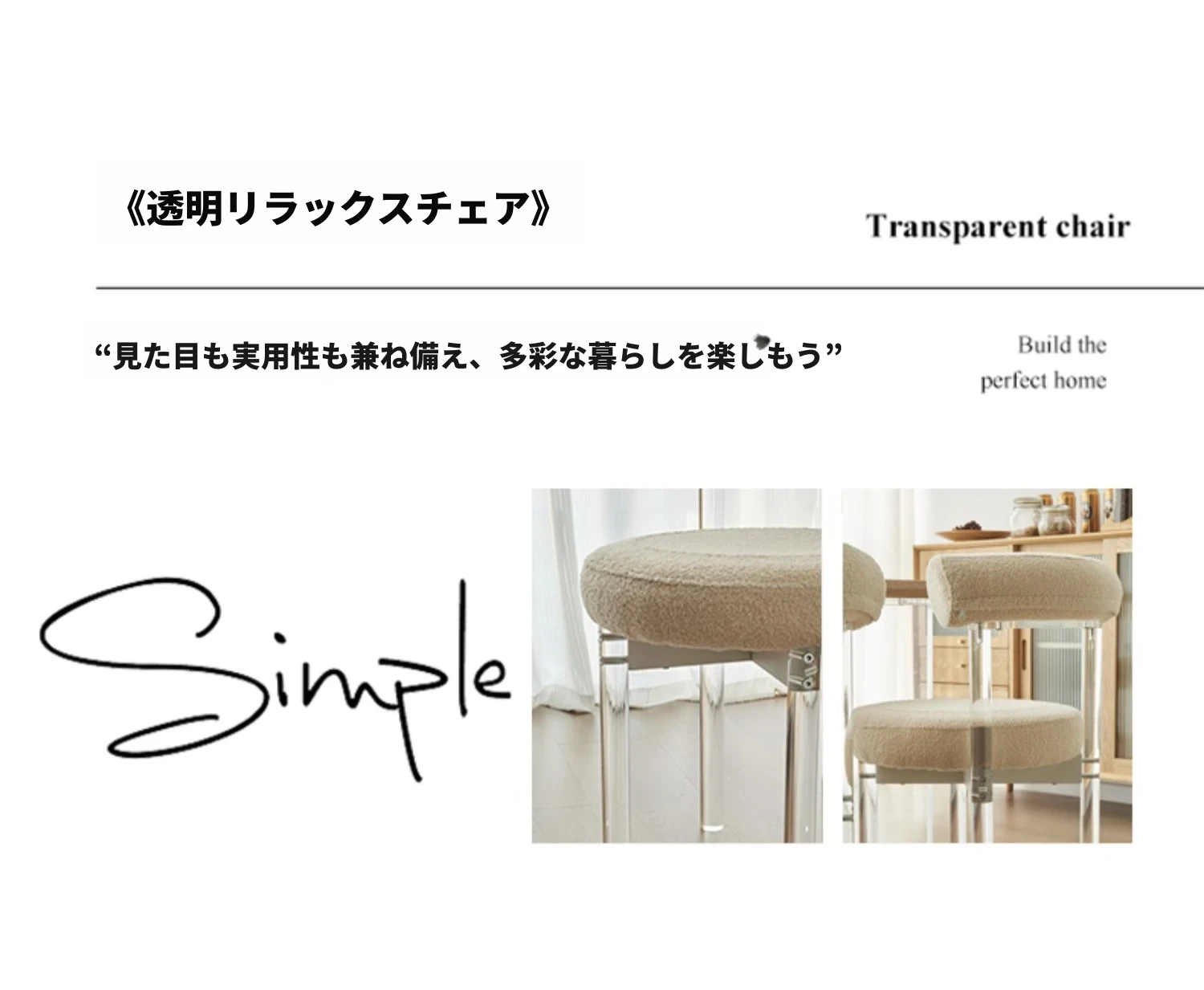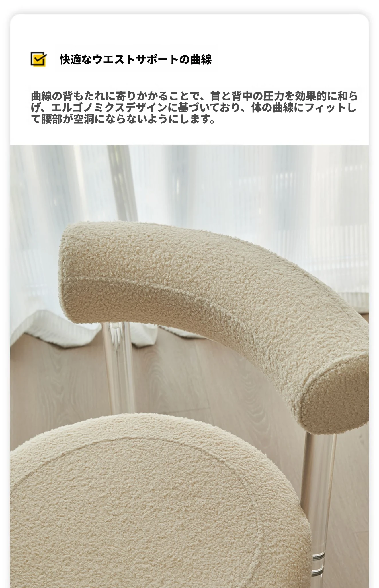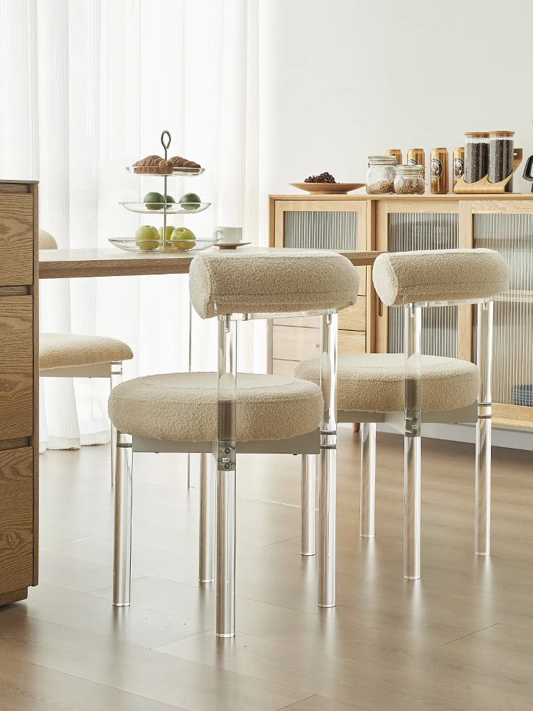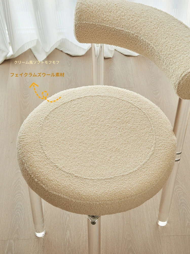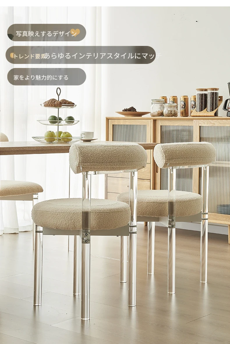 クリーム風アクリルダイニングチェア、透明な化粧椅子!スタイリッシュで快適、リビングや寝室にぴったり。背もたれ付きで、ダイニングテーブルやドレッサーに最適な一品!