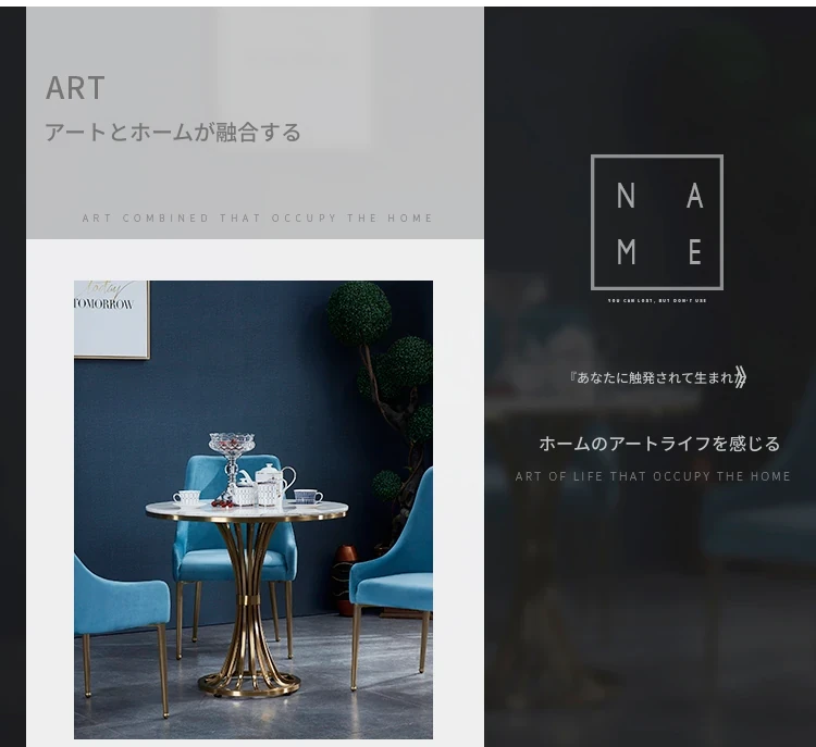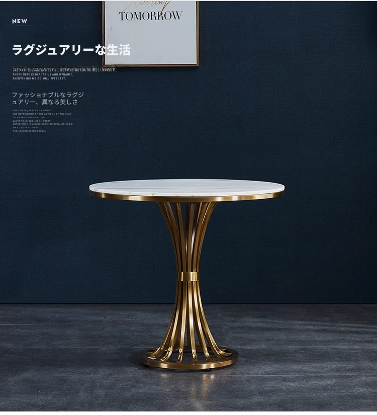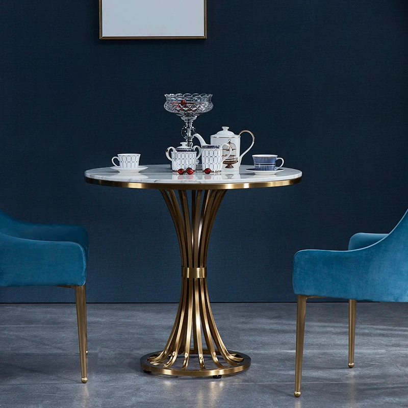 軽やかなラグジュアリー後現代風のステンレス製大理石小丸テーブル - 売り場、ホテルのフロントに最適なリラックス洽談用テーブル&チェアセット!洗練されたデザインで、上質な空間を演出します。