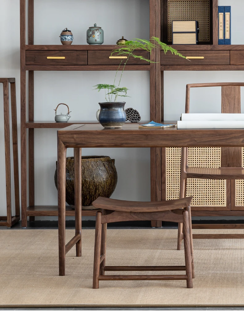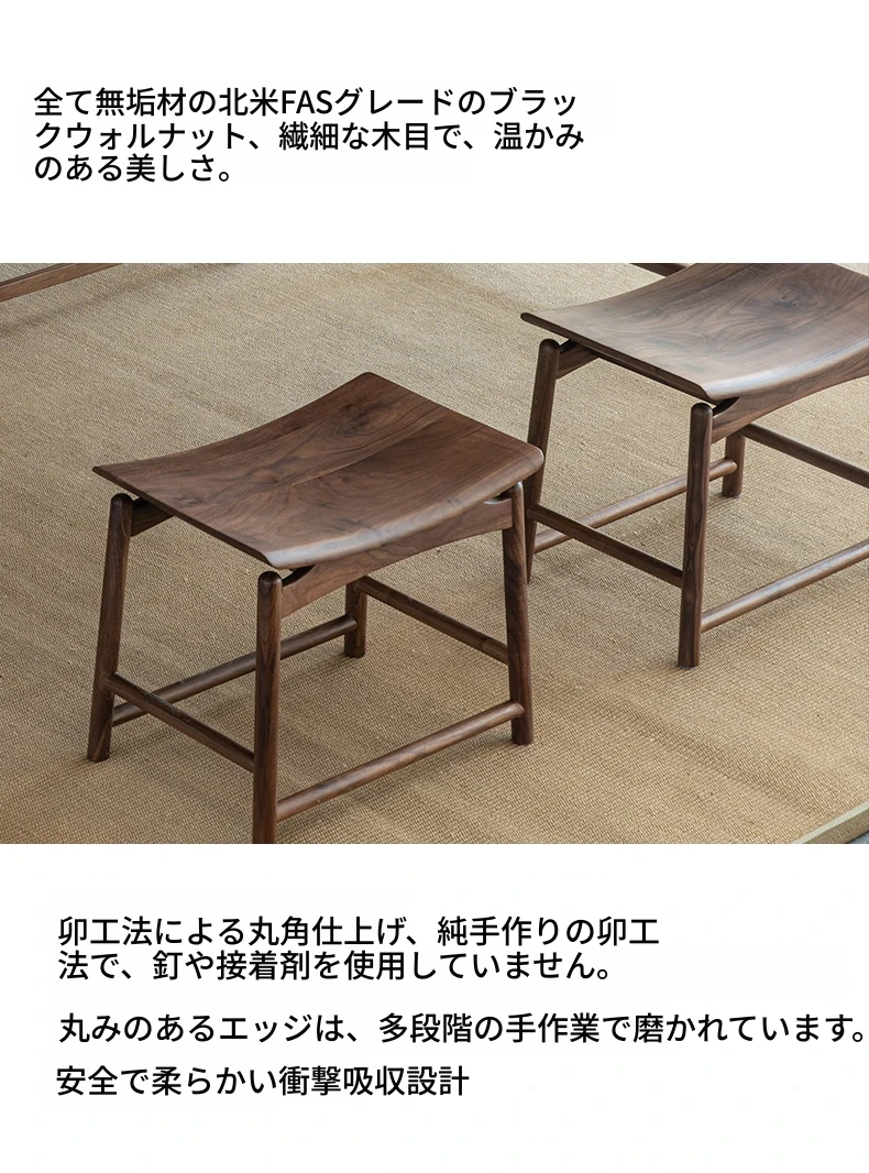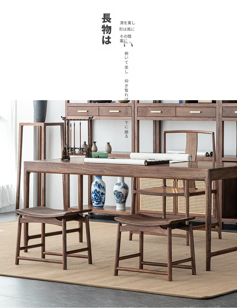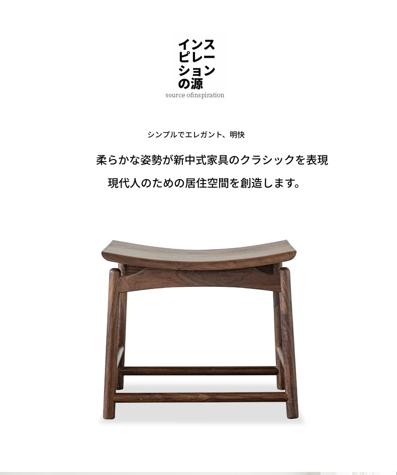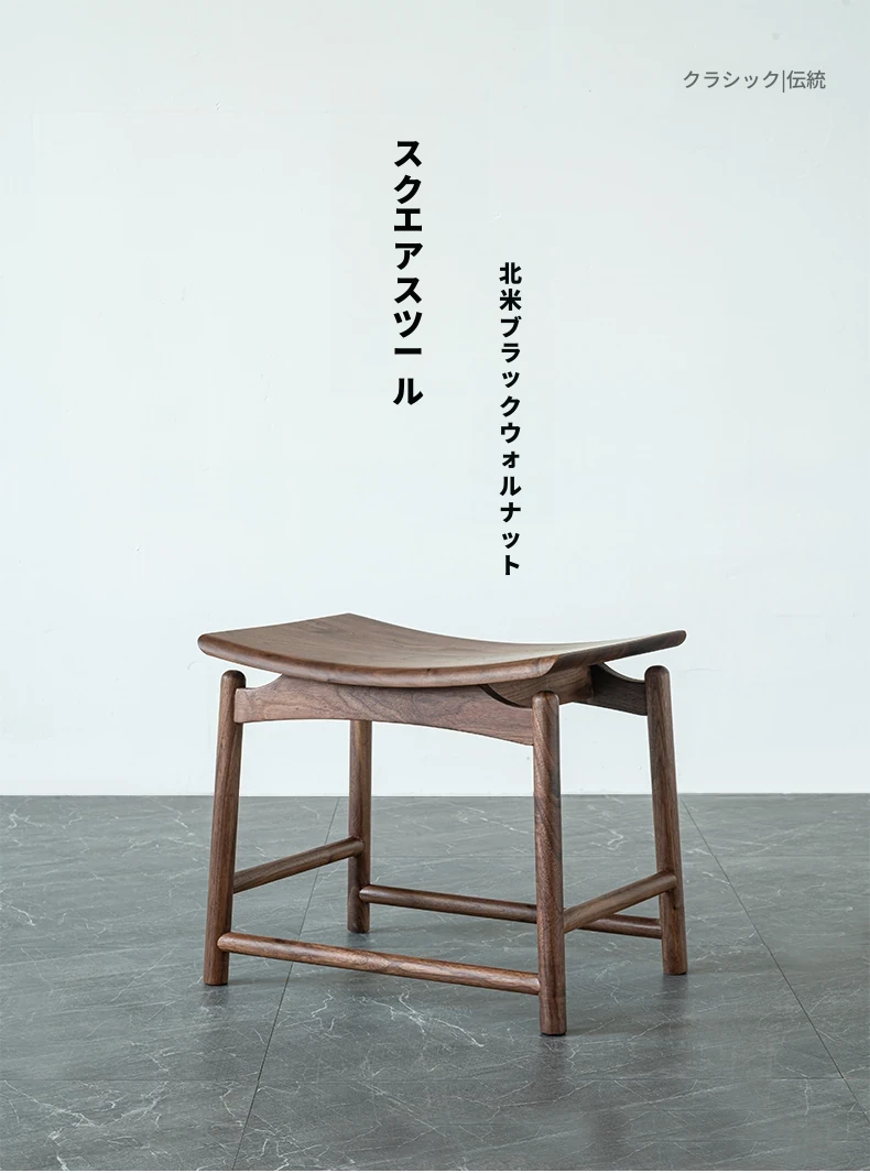 新中式全実木の黒胡桃製スツール - おしゃれで落ち着いた茶室にぴったりな四角いスツール。禅の雰囲気を楽しめる、リラックスしたひとときを提供するテーブル用椅子。食事やお茶の時間に最適です。