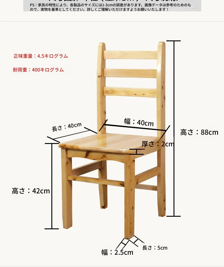 座面の高さ43cm、全体の高さ89cmのパインダイニングチェア