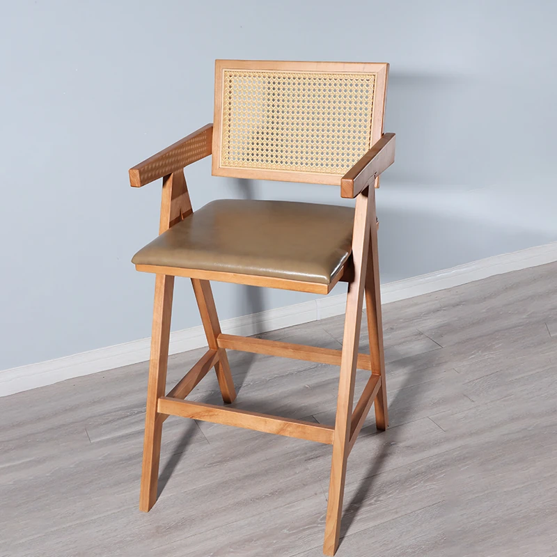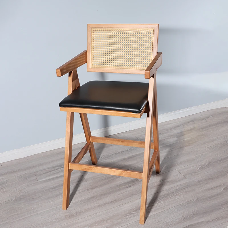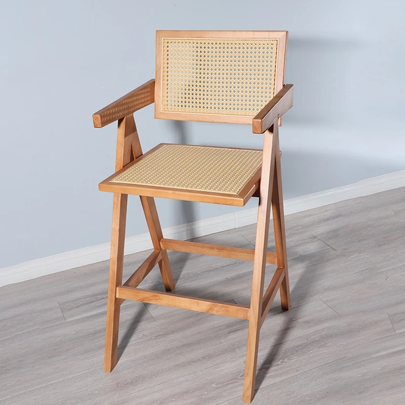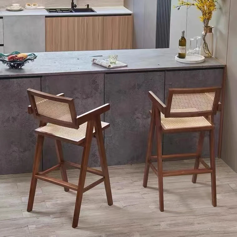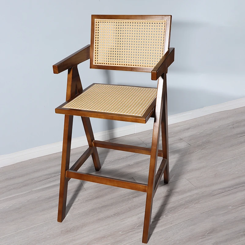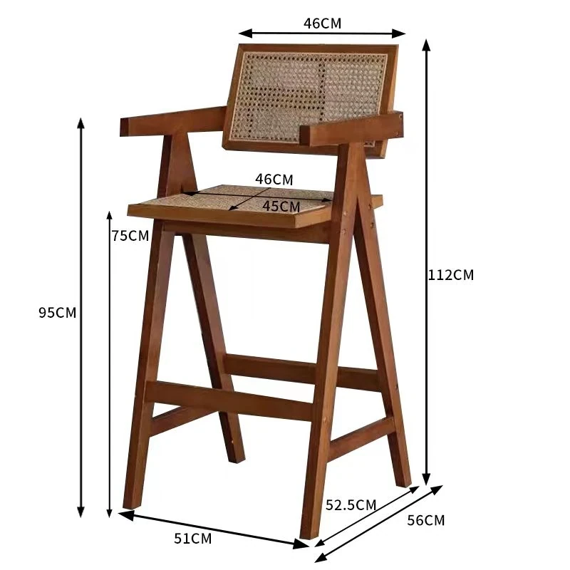 シンプルで洗練された北欧スタイルの和食レストラン向け、チャンディガール製の無垢材と籐編みの椅子。快適な背もたれ付きのハイバースツール、家庭用にも最適!