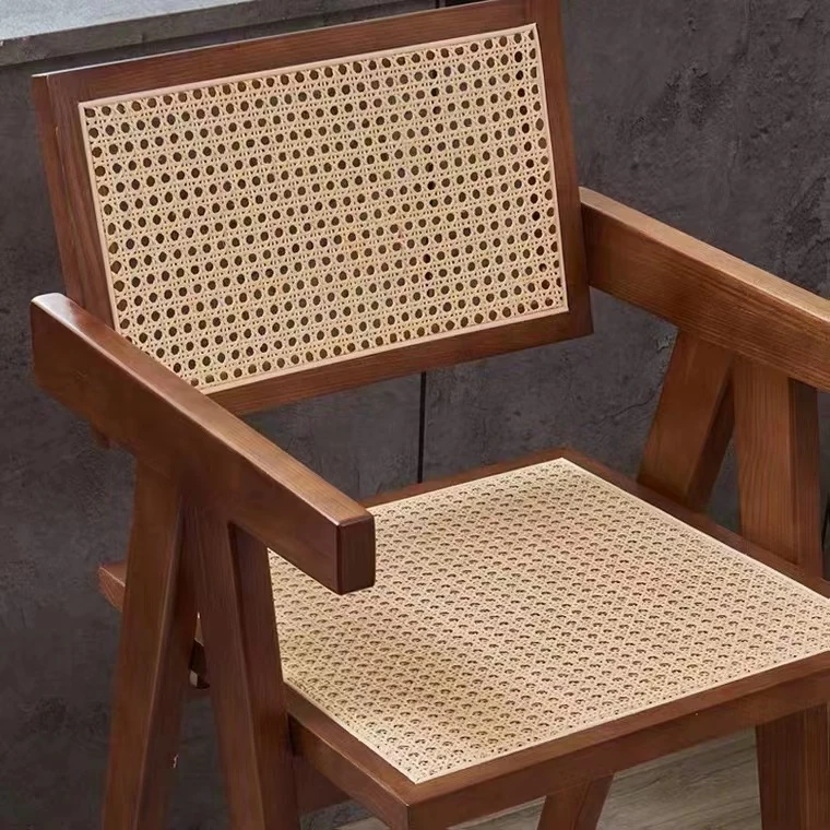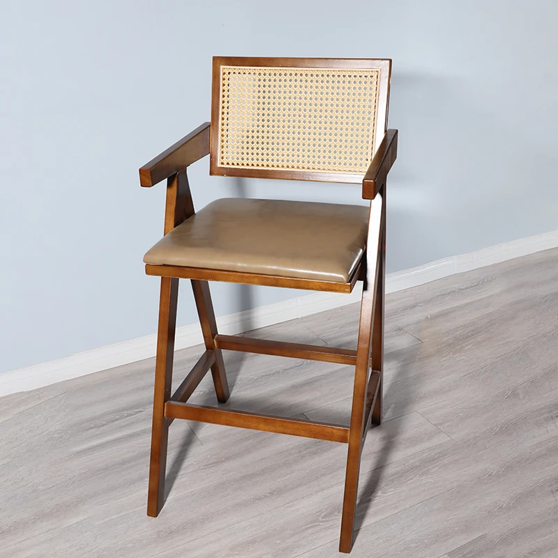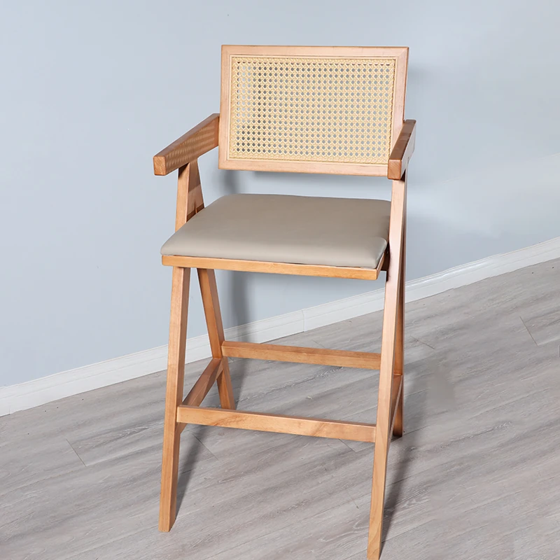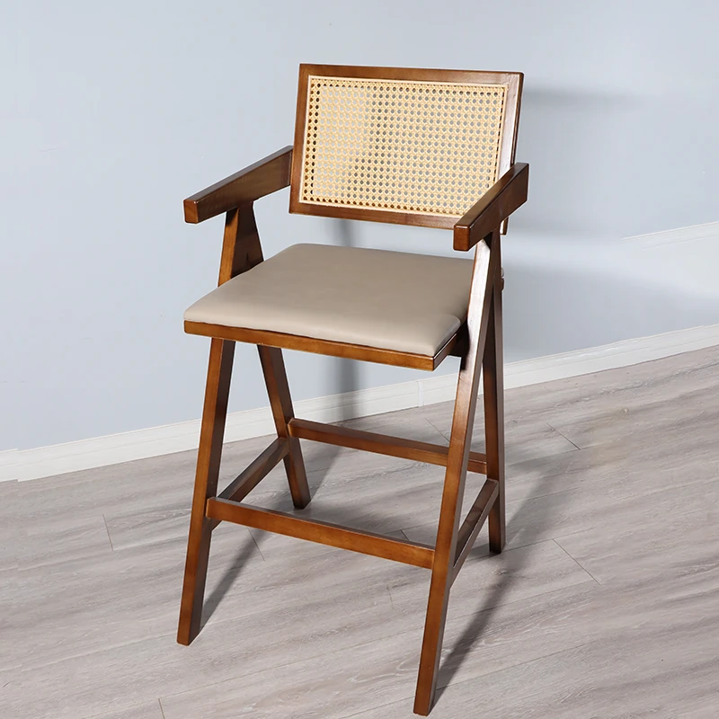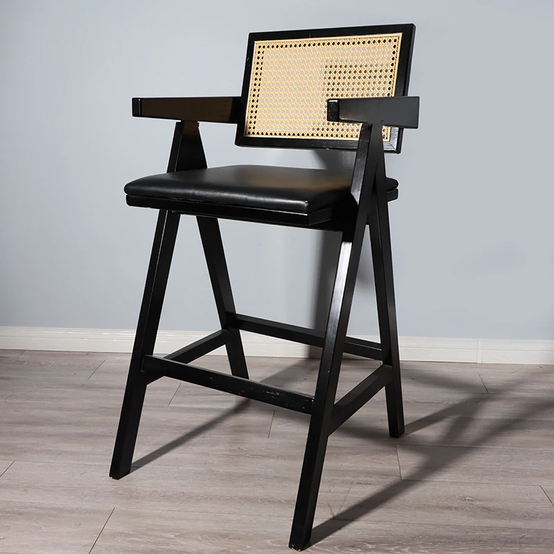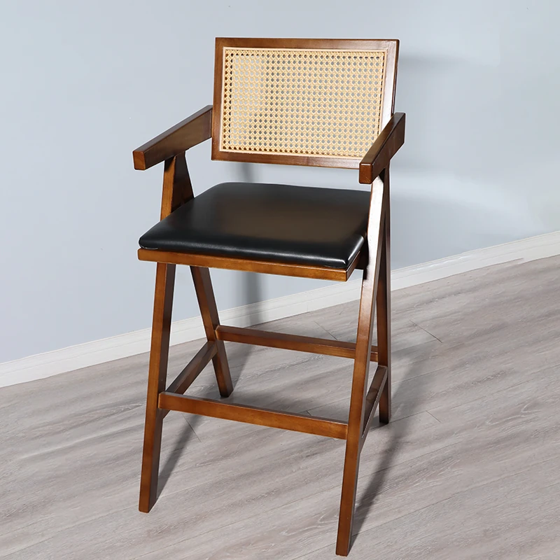 シンプルで洗練された北欧スタイルの和食レストラン向け、チャンディガール製の無垢材と籐編みの椅子。快適な背もたれ付きのハイバースツール、家庭用にも最適!