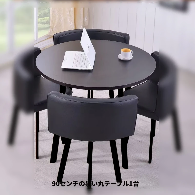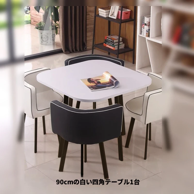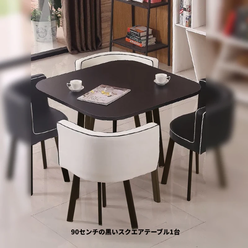 4つの黒い皮のサイドチェア + 90cmの正方形テーブル
