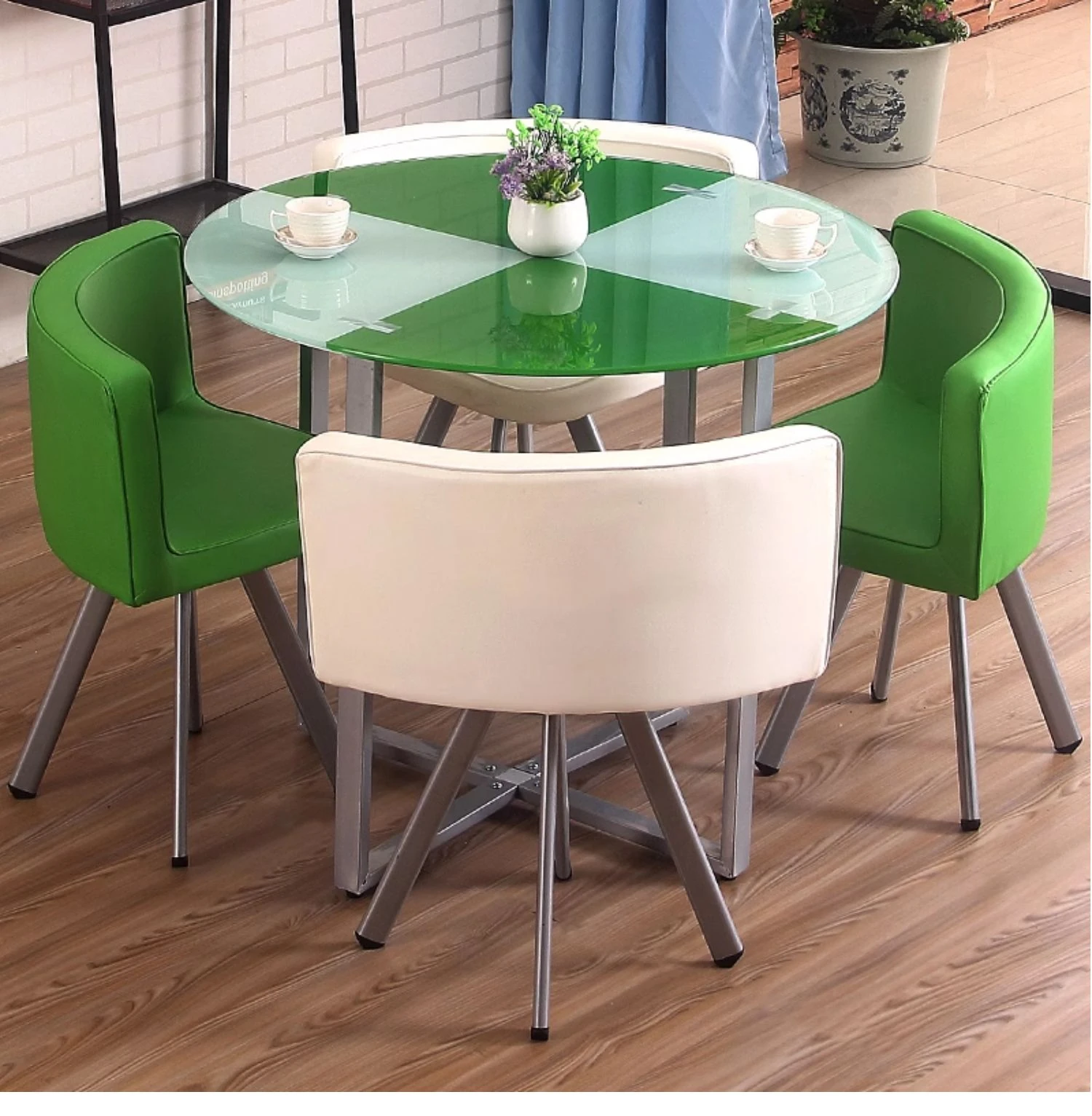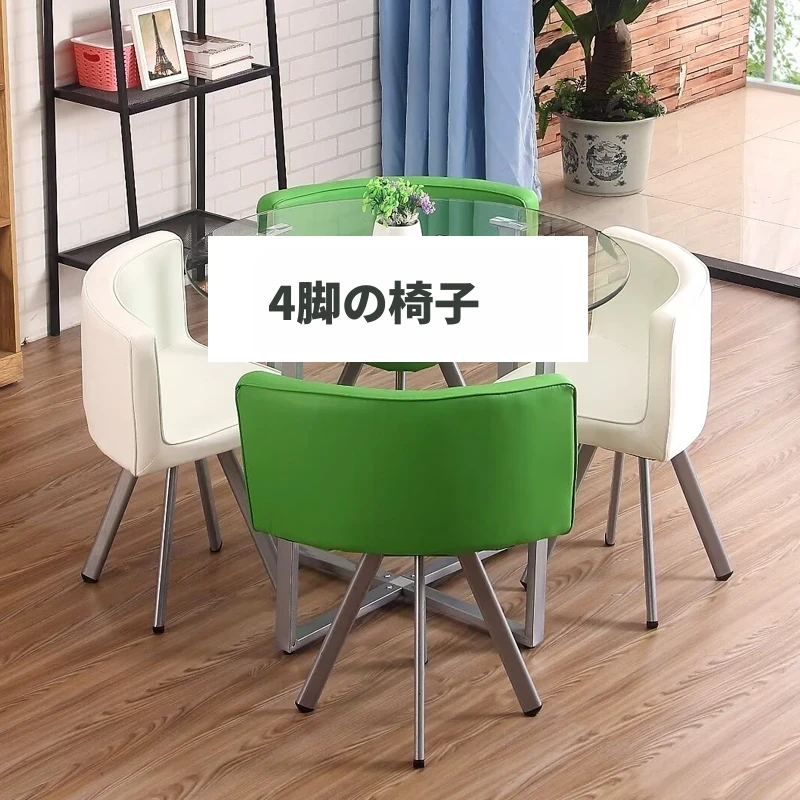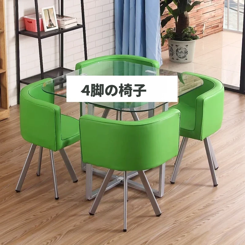 2つの緑の椅子 + 2つの白の椅子 + 銀色の脚