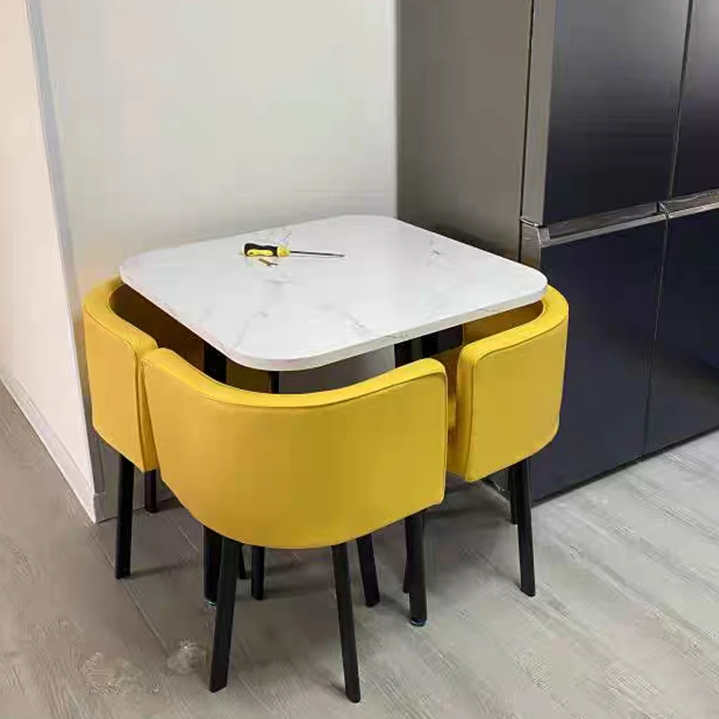2つの黄色のフェイクレザー椅子と2つの黒のフェイクレザー椅子、90cmの黒いテーブル